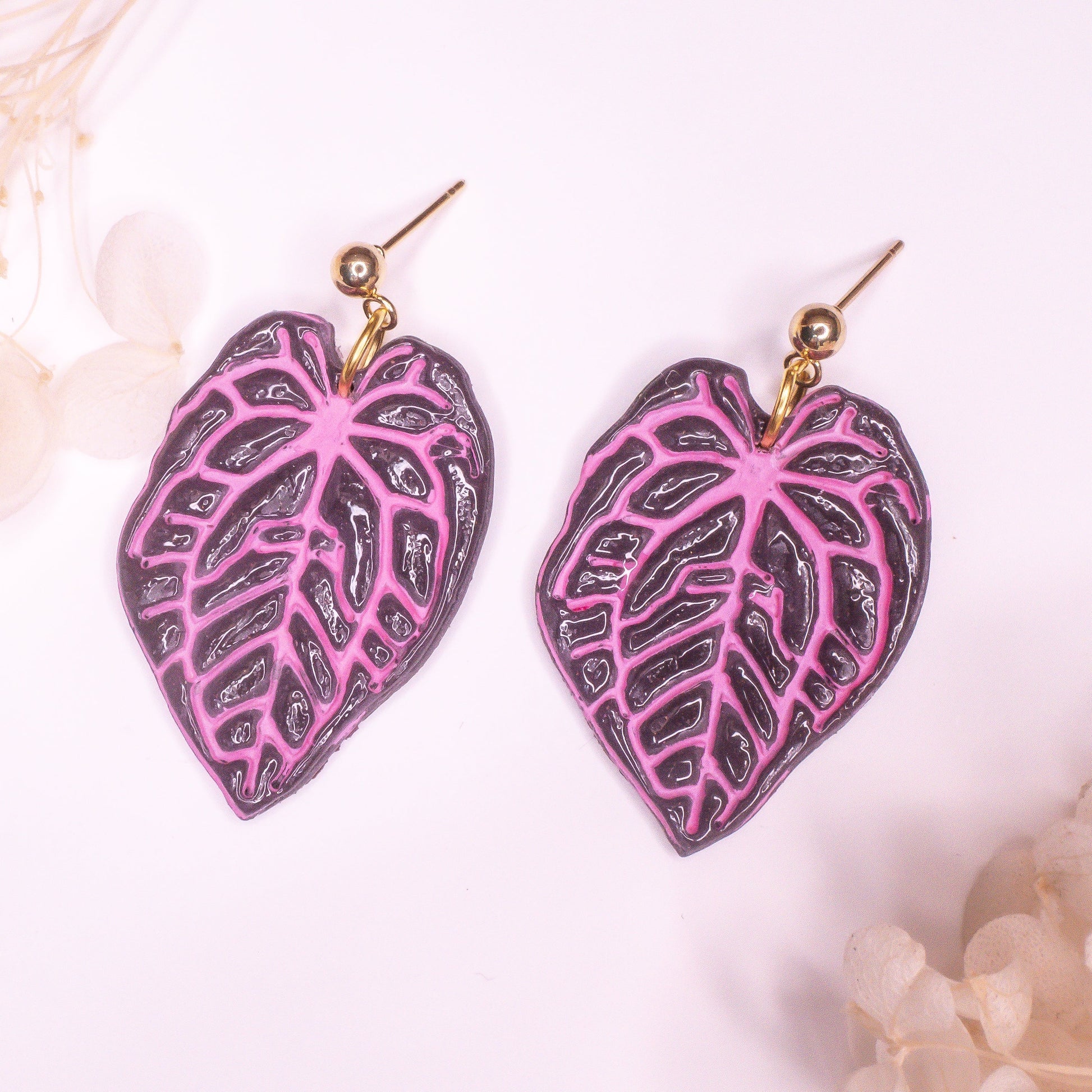 Bold, rare, and full of character—these Anthurium Michelle x Zara earrings blend deep tones with striking pink veining in a heart-shaped leaf silhouette inspired by exotic hybrids.