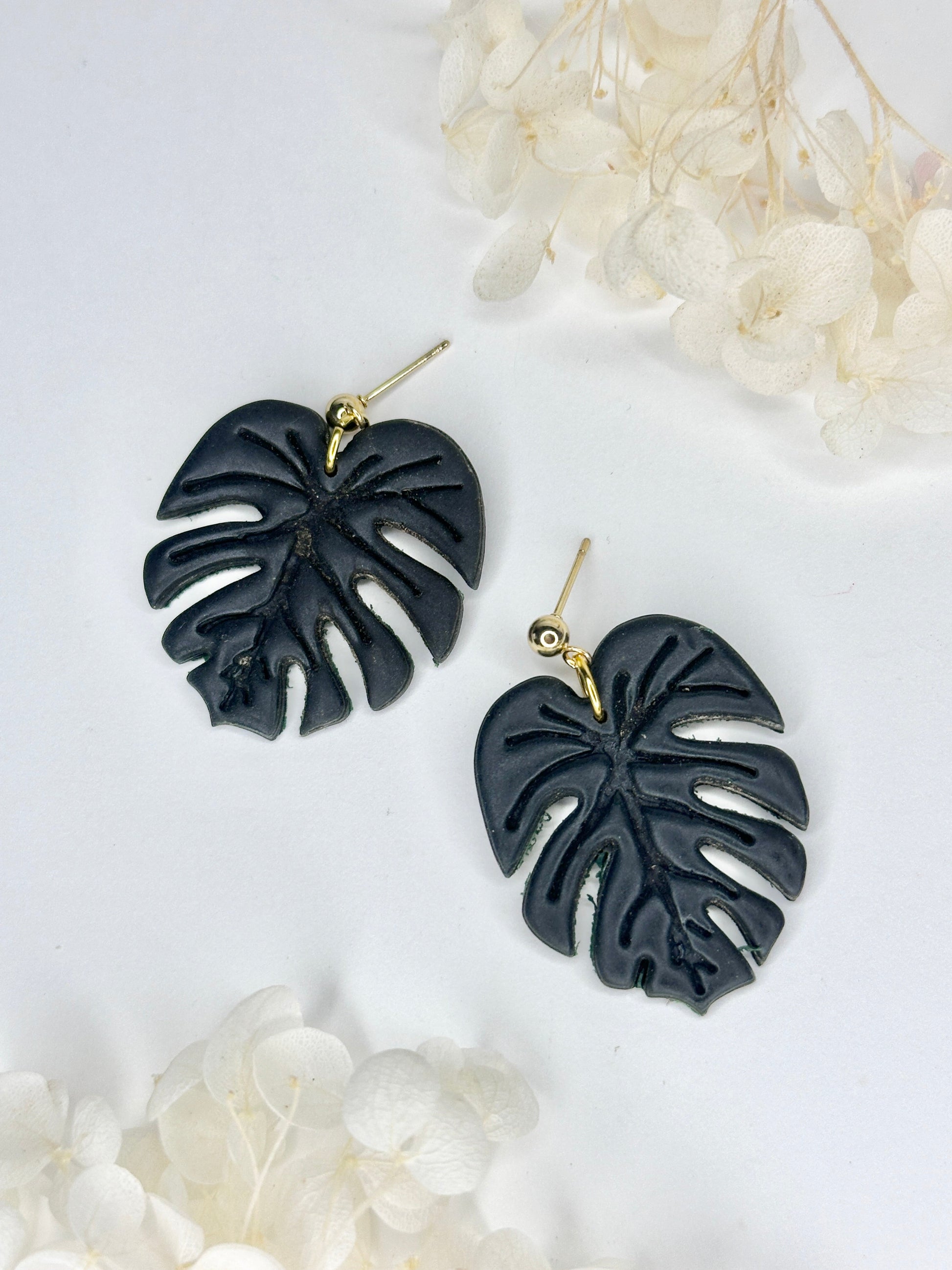 Sleek and sophisticated—these Black Monstera earrings reinterpret the tropical classic with a modern twist. Each pair is hand-sculpted and detailed to capture the signature split-leaf silhouette of the Monstera deliciosa, finished in deep matte black for a bold yet elegant statement. A perfect blend of botanical charm and contemporary style.