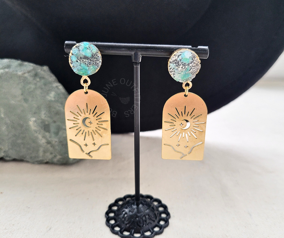 Made of all hypoallergenic materials: raw brass, gold plating and the druzy is made of resin (approx. 13mm). The length of the earring is 2".