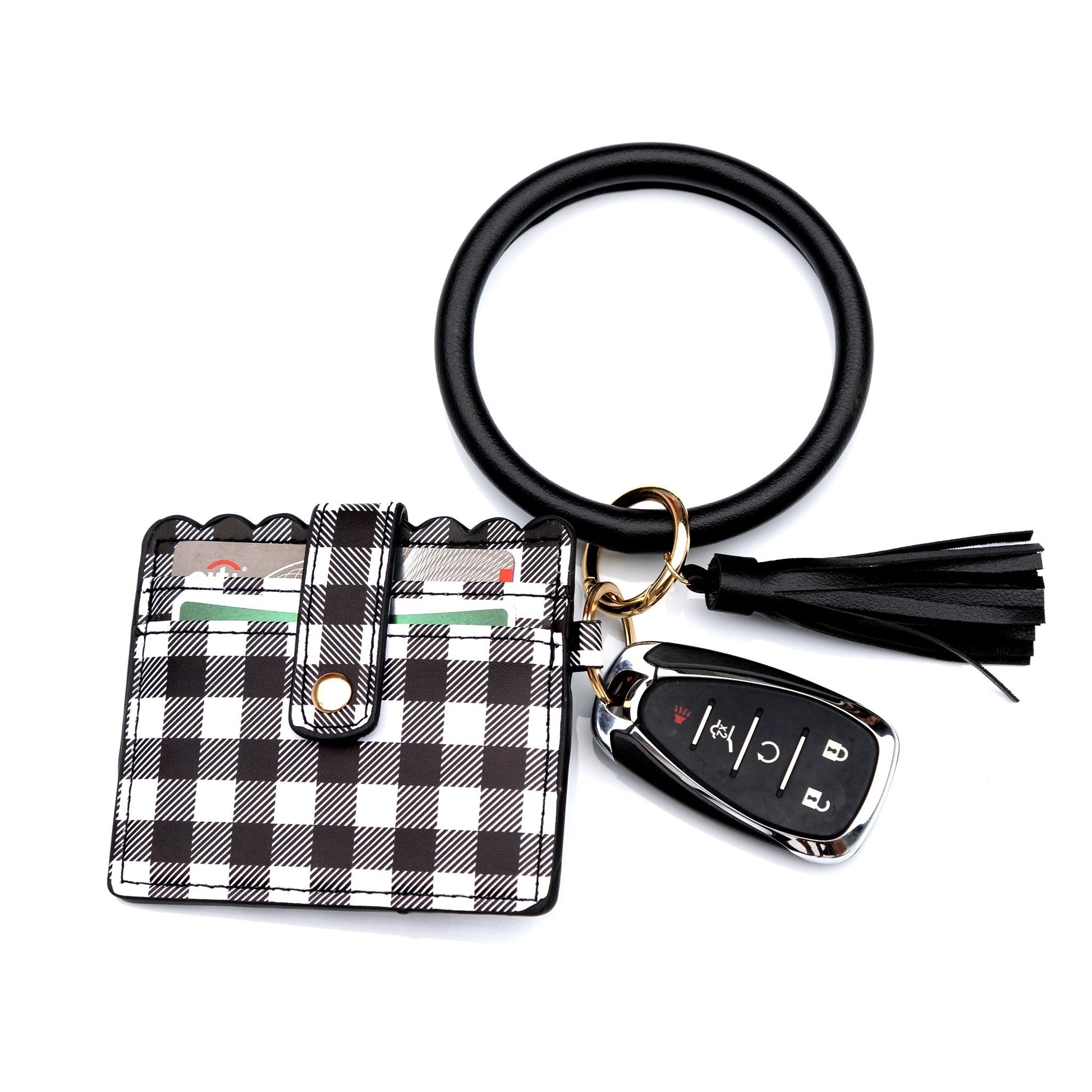 Add a bit of iconic buffalo print this season with our limited edition Buffalo Key Ring ID Wallet Bracelets! Perfect for when you are out and about and need things simple! Featuring double-sided credit card slots, a pocket perfect for cash, and a fold-over button snap closure to keep everything secure, these will be your new go-to! A cute little tassel adds a bit of style! Grab your keys, cash/ cards, ID, and go!
