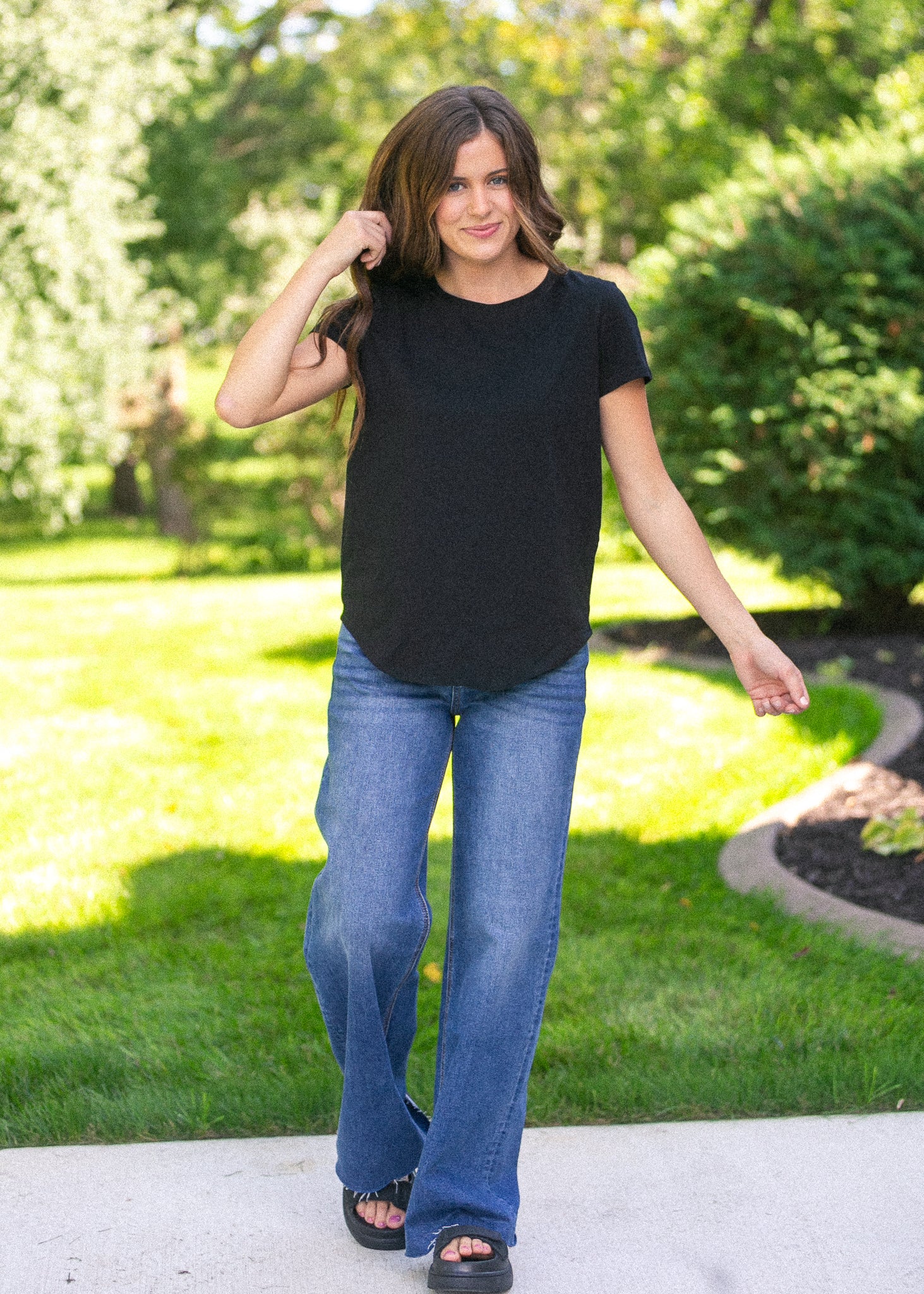 With the same fit as our Crewneck Striped Tee, the Essential Crew Basic Tee is going to be the perfect basic modest tee this season! This shirt makes a versatile choice in your wardrobe and can be styled in a variety of ways - pair with our Quinn Knit skirt, denim skirt, overall dress, a-line skirt...the opportunities are endless! It is made from a soft and breathable fabric to ensure cool comfort!