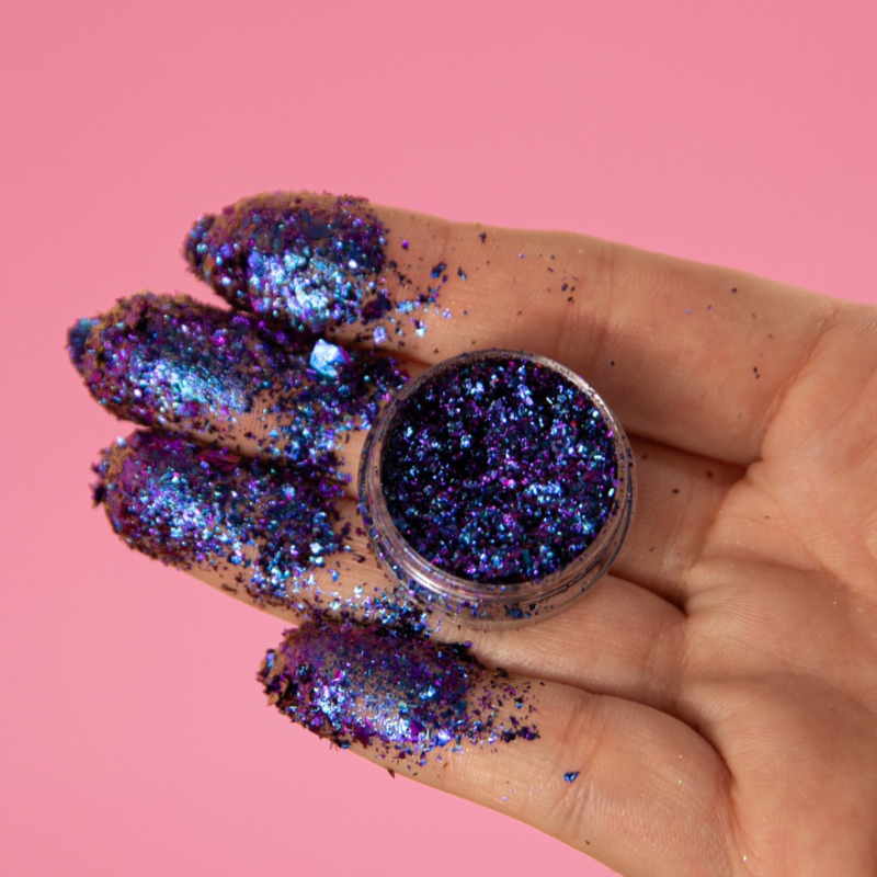 Glow particle, metallic, multichromatic, chameleon-like. It acquires different shades depending on the angle of light. Particle size 10-2000 microns. It should be used on an adhesive base (recommended Naba adhesive glue), it improves its adherence and does not alter the color. Size 2-4 GR depending on density.