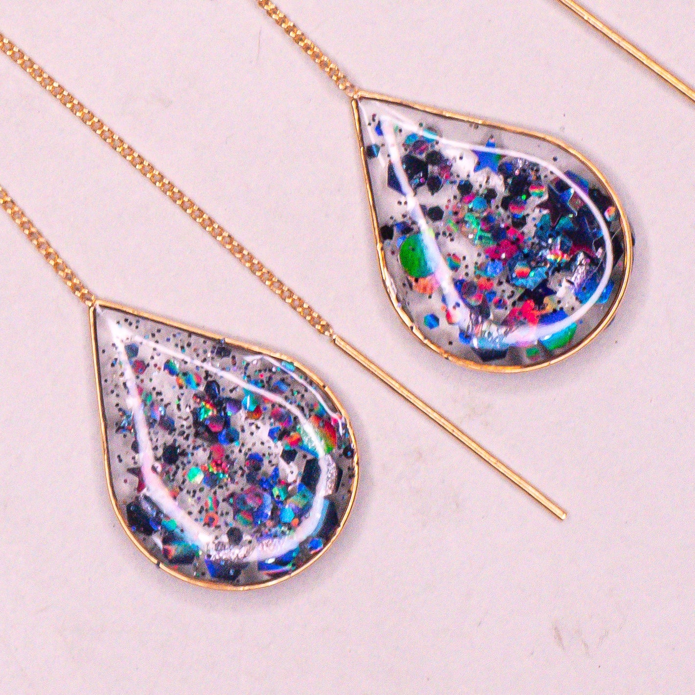 - Resin mixed with varied sizes of deep navy blue holographic glitter for a festive, sparkling finish