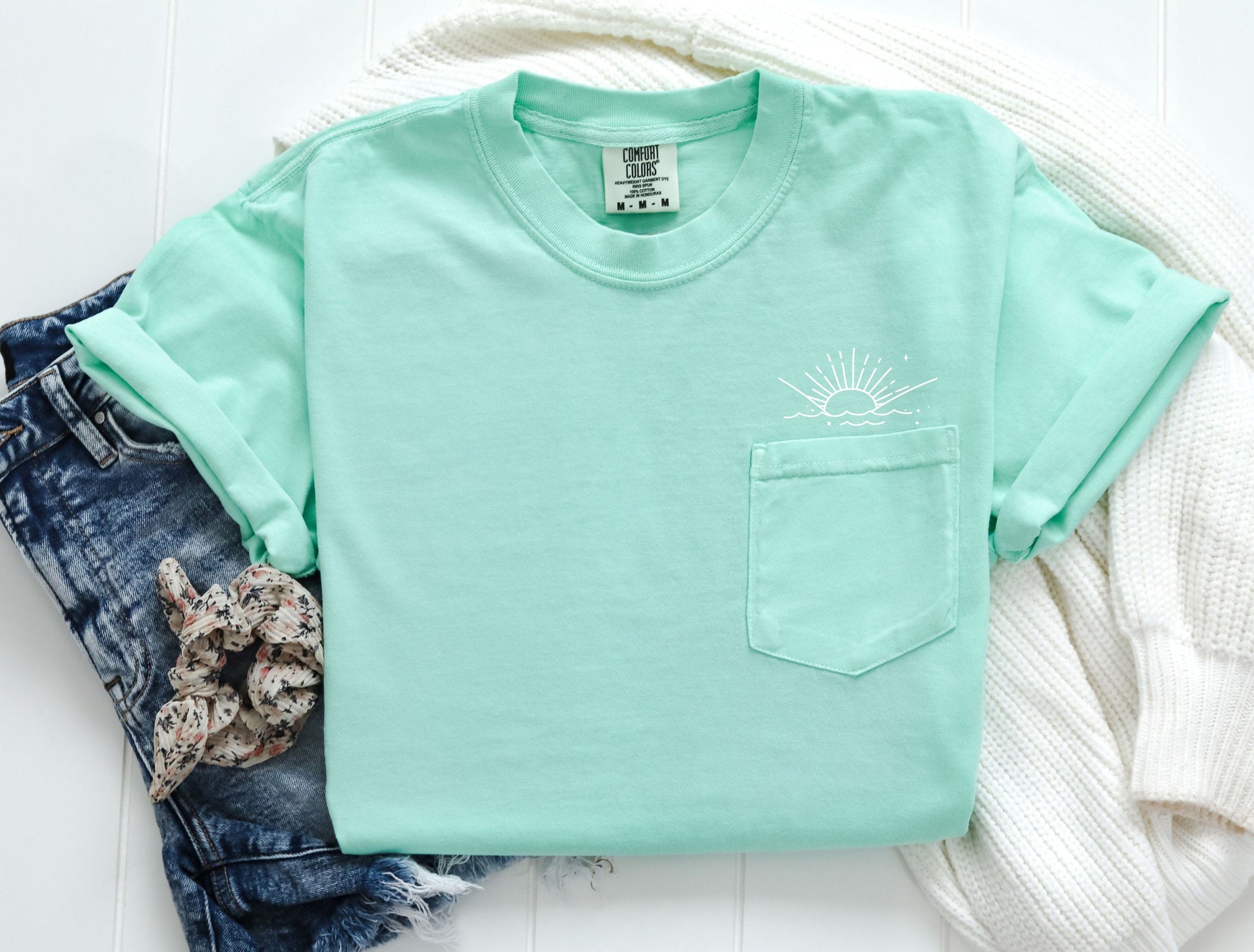 Sun and Wave Lake Beach Comfort Colors Pocket T Shirt | Nature, Camping, Plant (2)