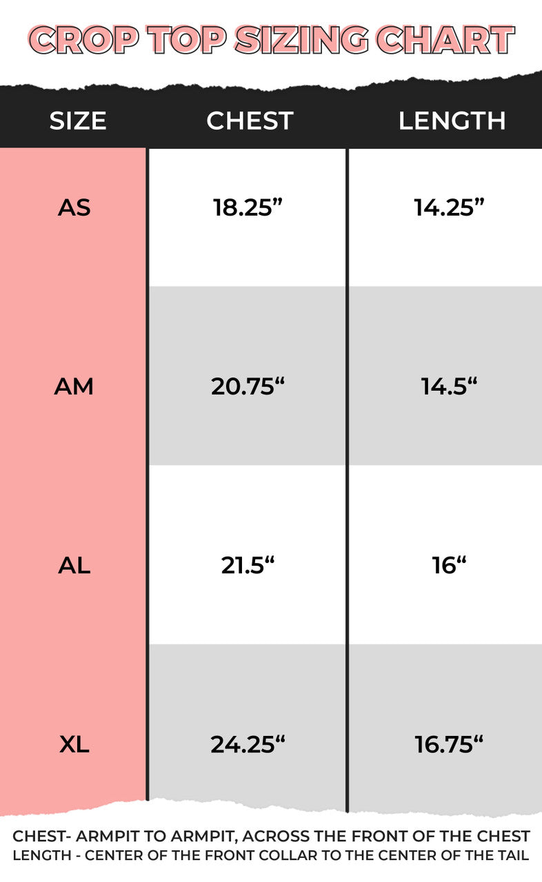 - Sizing Hint: This is a basic unisex crop top, which fits true to size. See additional images for sizing charts.